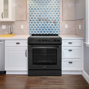 • Range is designed with safety in mind, featuring an oven cavity cooling ventilation system for safe heat dissipation, overheating protection, and a cool-to-touch oven handle to prevent burns