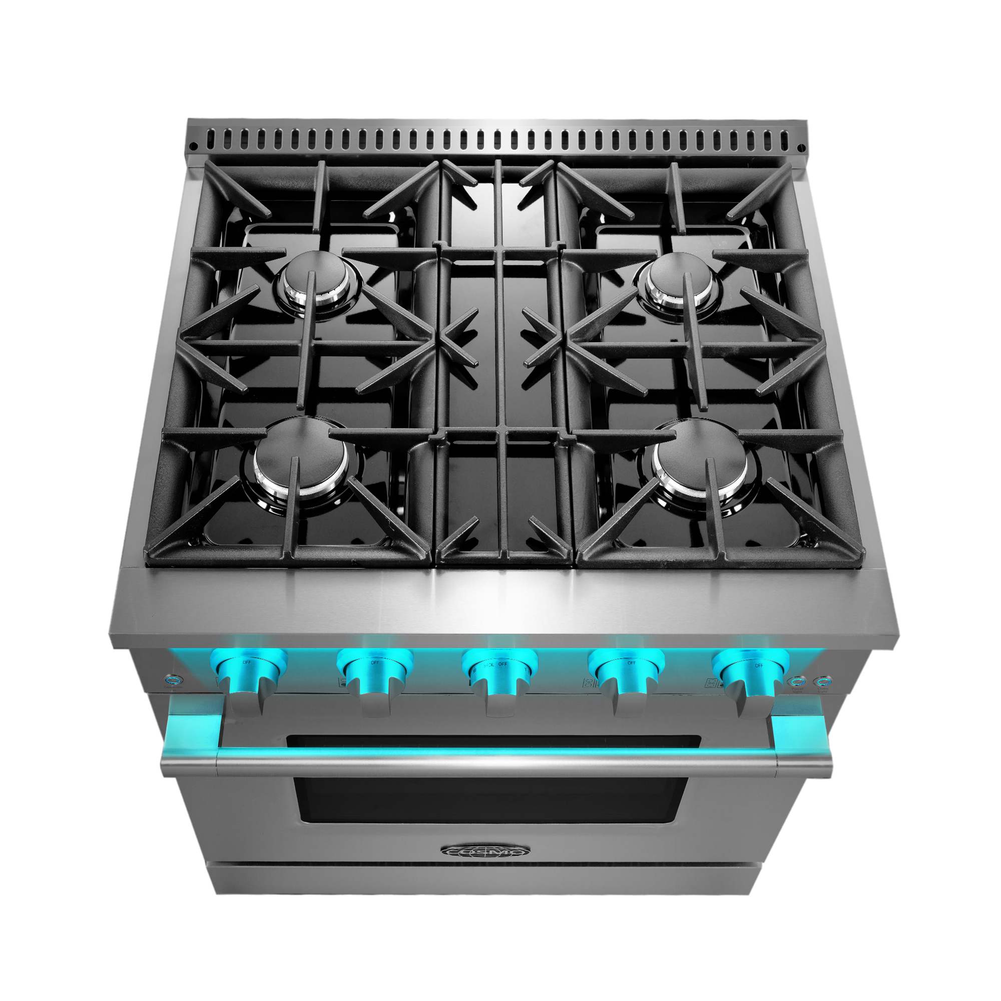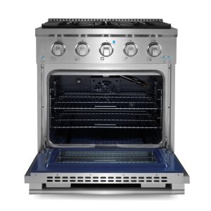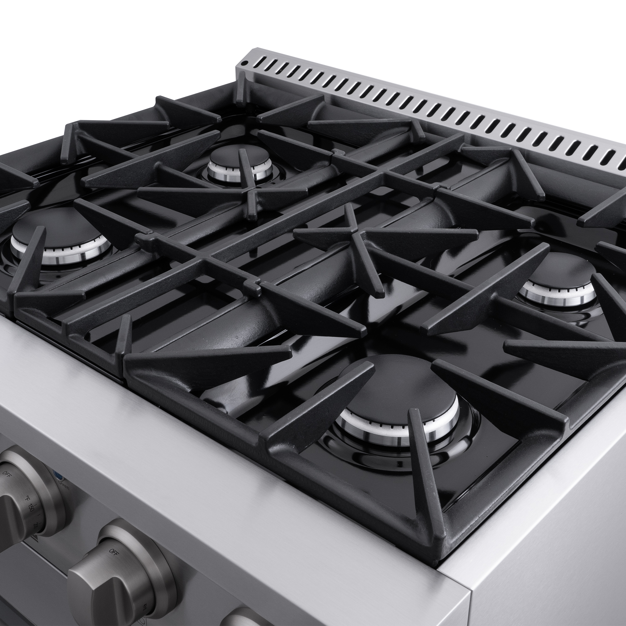 - High end styled gas range constructed of corrosion-resistant 304-grade stainless steel, with full metal knobs and a matching stainless steel oven door handle