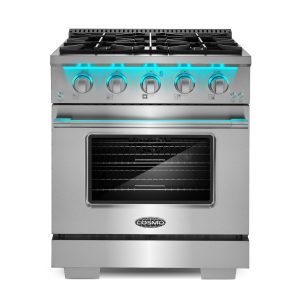 Transform the way you cook with Cosmo’s COS-GRP304 4.3 cu. ft. 30 in. gas range. Made with convenience in mind, enjoy 4 sealed burners to give you the precision to cook a variety of different foods and sauces: 2 x 15,000 BTU, 2 x 9,000 BTU. A powerful fan circulates air in the oven cavity for perfect, evenly cooked meals with four oven functions to give you the cooking options to suit any need. Featuring an elegant panel light that beautifully illuminates the range knobs, this design allows for easy navigation of controls and can also serve as a handy nightlight for your kitchen. Designed for durability, this range is constructed with industrial-grade stainless steel, built to last for years to come. A removable backsplash allows this range to be versatile, able to install in both freestanding and slide-in applications. Part of the Vista Collection, bringing enhanced functionality and design, offering a well-rounded option for those looking for more convenience and style in an appliance. A better home starts with Cosmo.